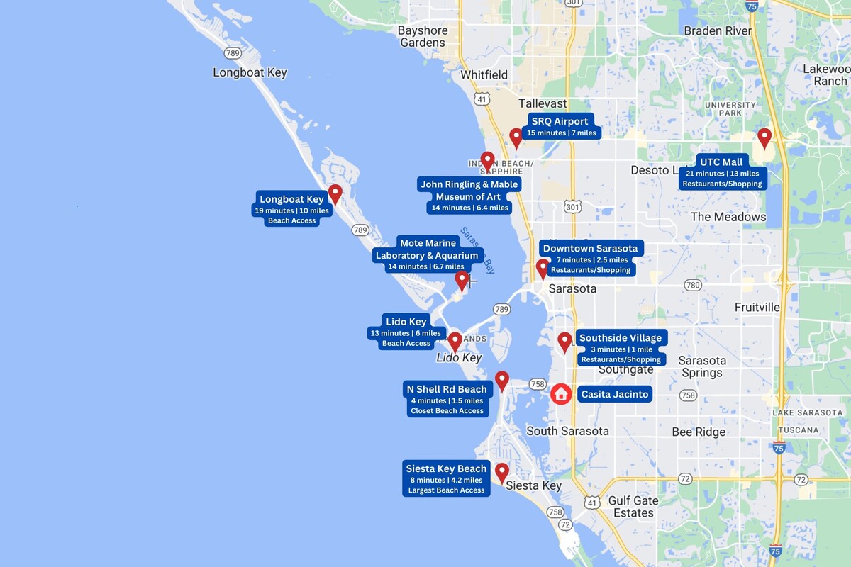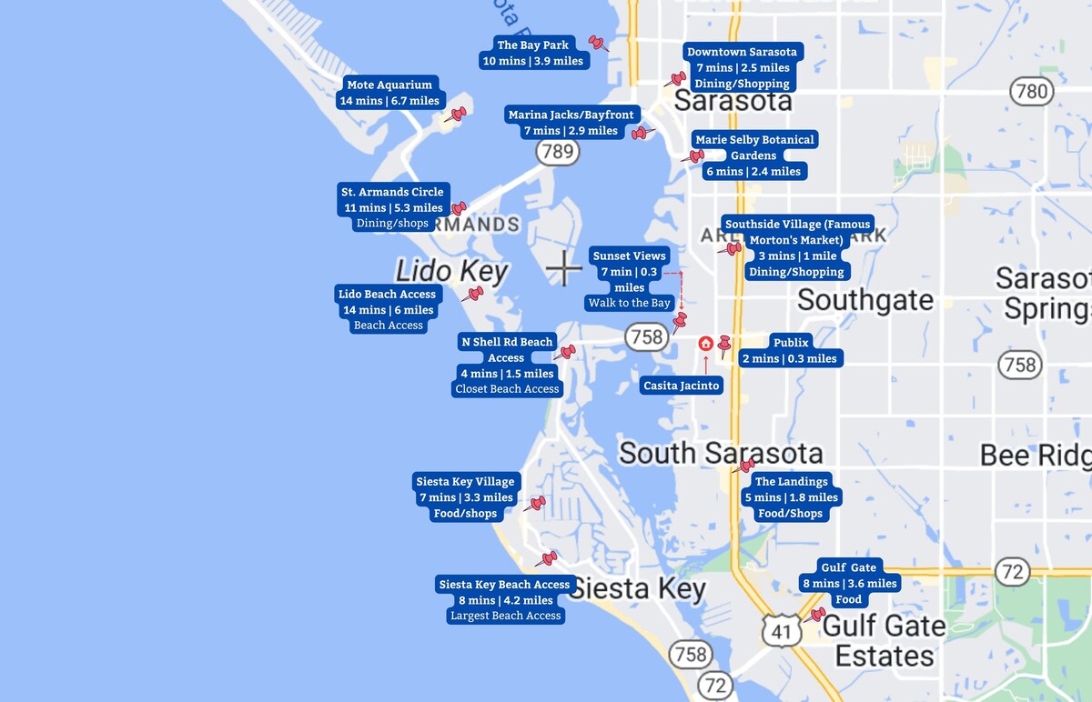 Getting aroundCar is best option to get around. The closest beach access is (N Shell Rd Beach access on Siesta Key: 1.5 miles). It is around 2-4 miles to the Siesta Key main Beach access and Downtown. Biking is very doable and great way to see the Florida coast. Can walk down the bay for Sunset in about 6-10 minutes being a little over 1/3 of a mile from the house.