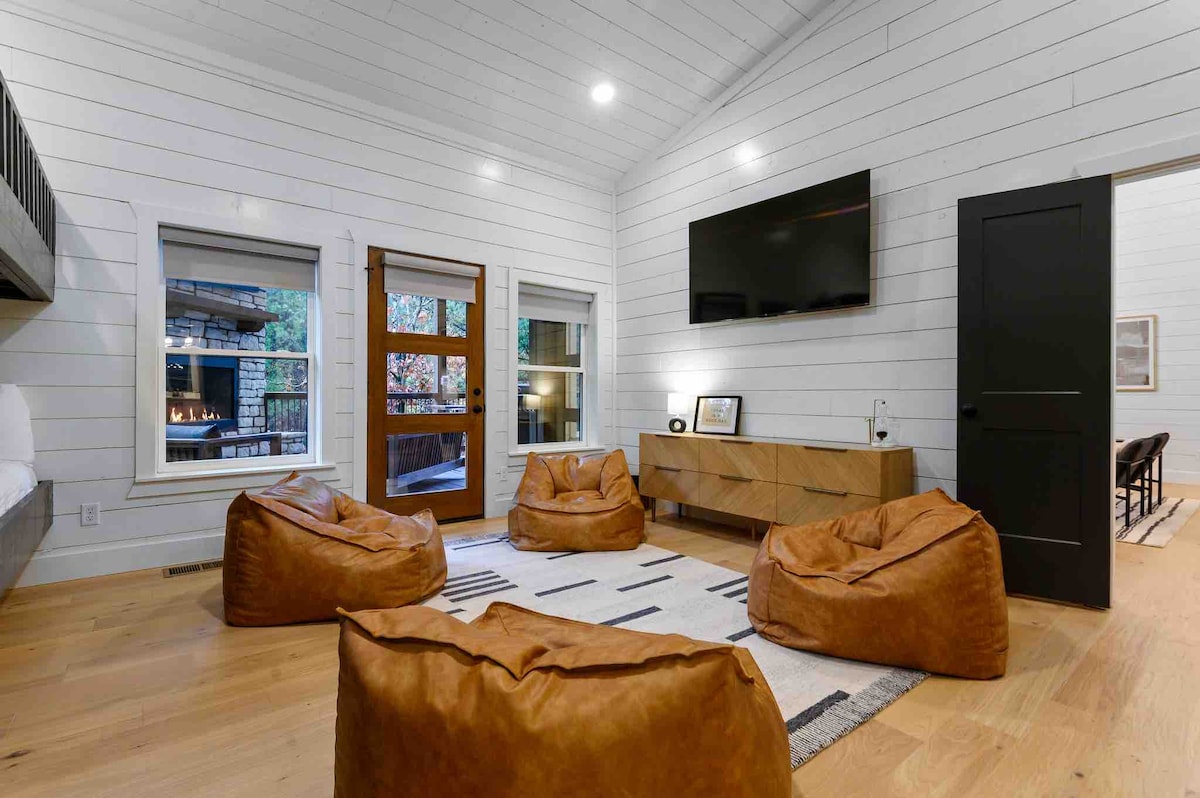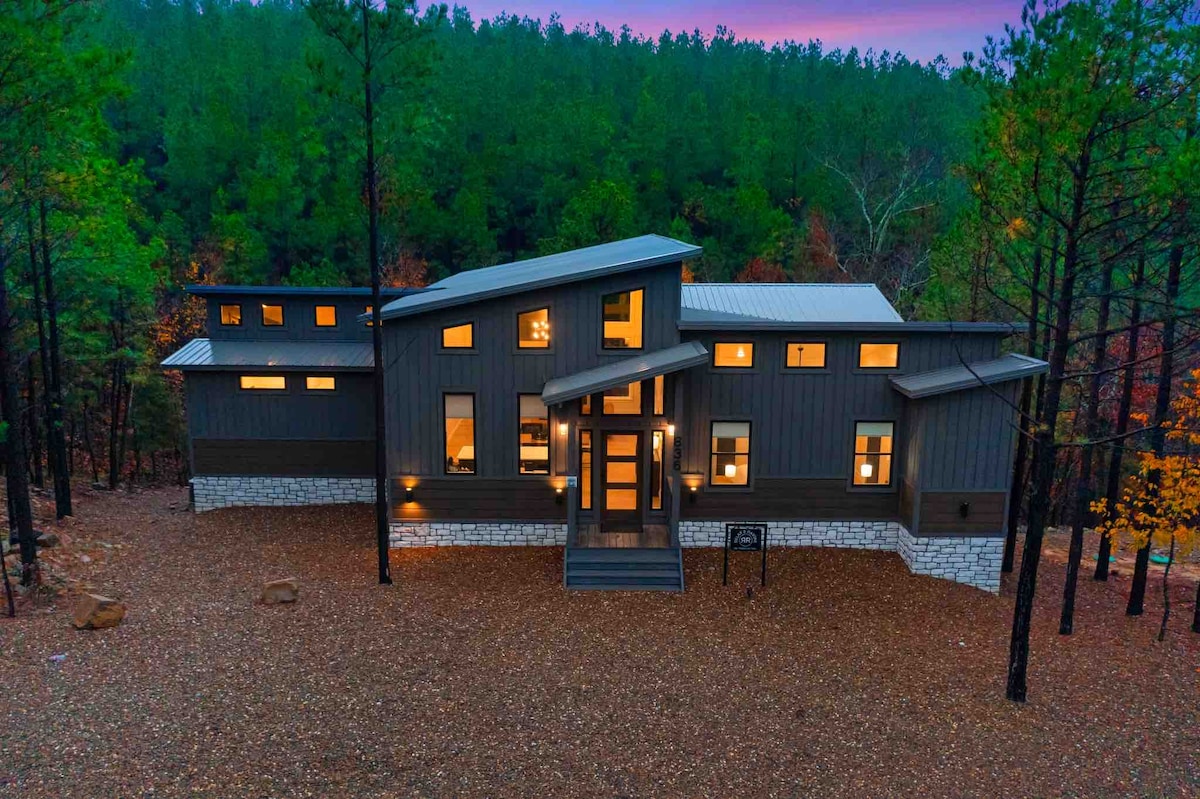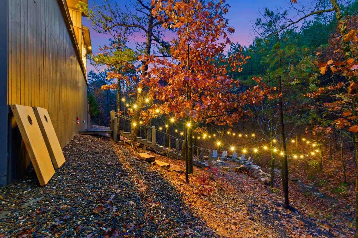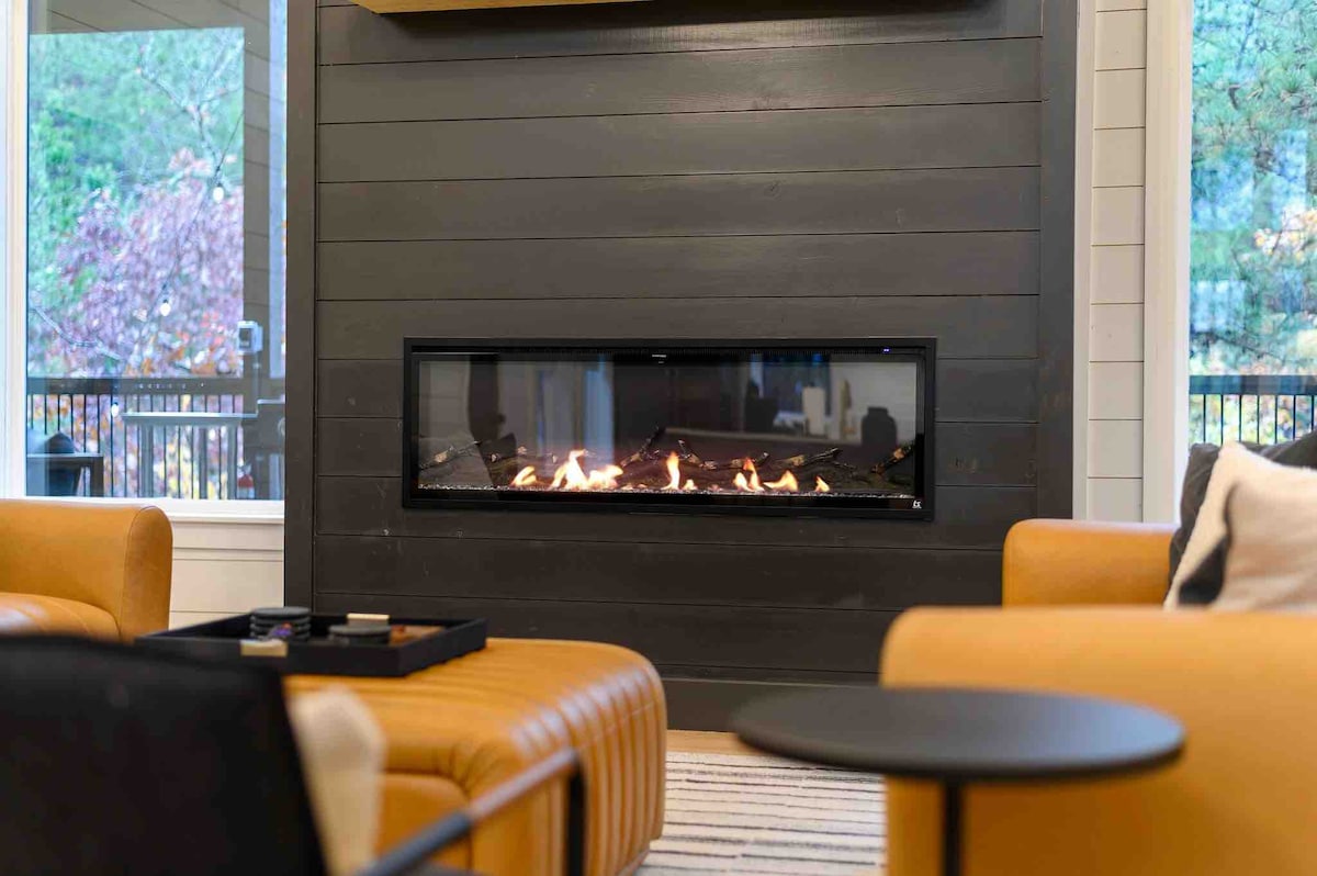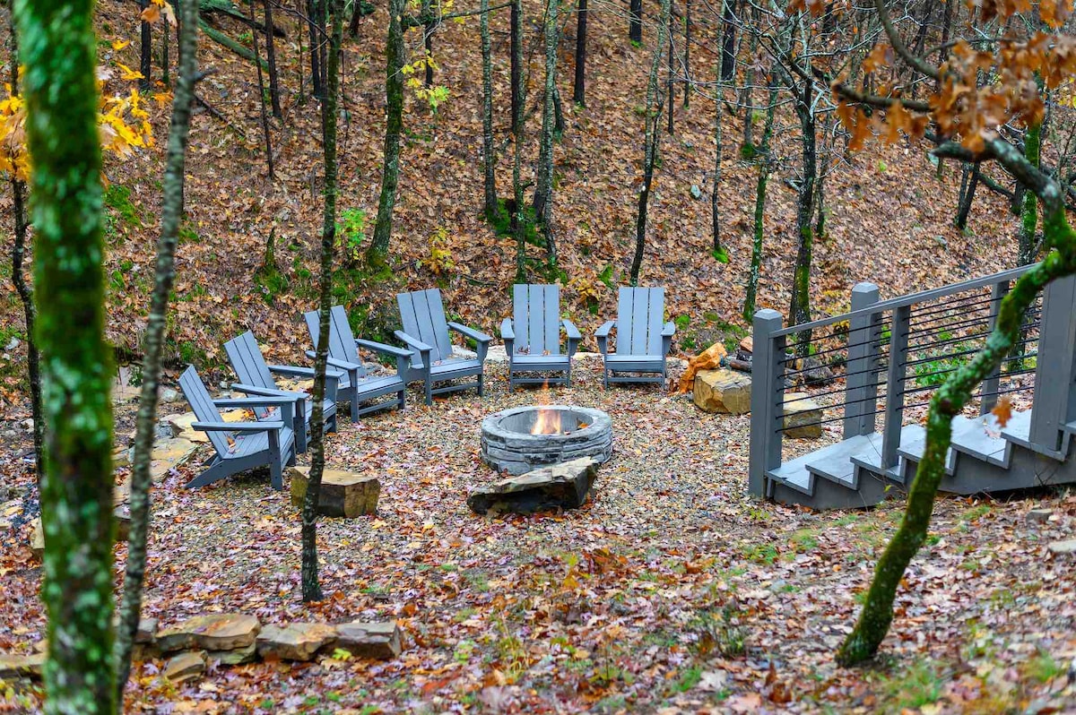 The spaceUpon entering this NEW, modern, and high-end furnished cabin, you'll be greeted by expansive windows framing breathtaking views. Step onto one of two decks to savor the scenery. Gather around the exquisite live-edge acacia wood dining table, perfect for creating unforgettable memories with seating for up to 10. Venture down to the fire pit for s'mores and creek-side fun