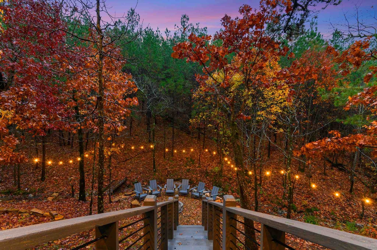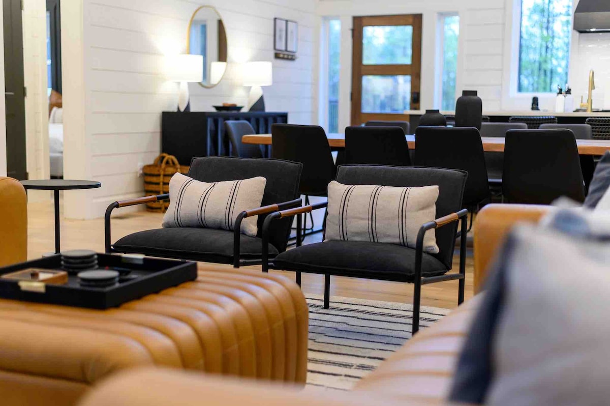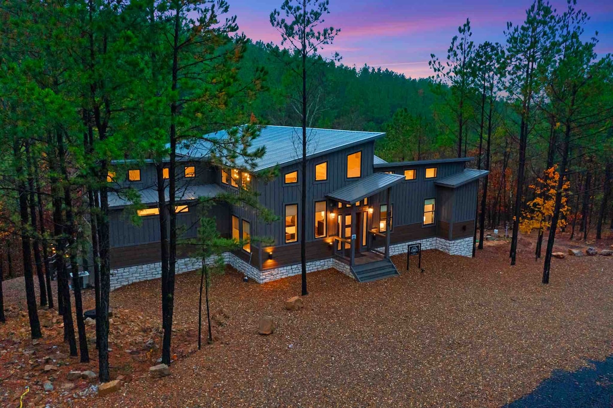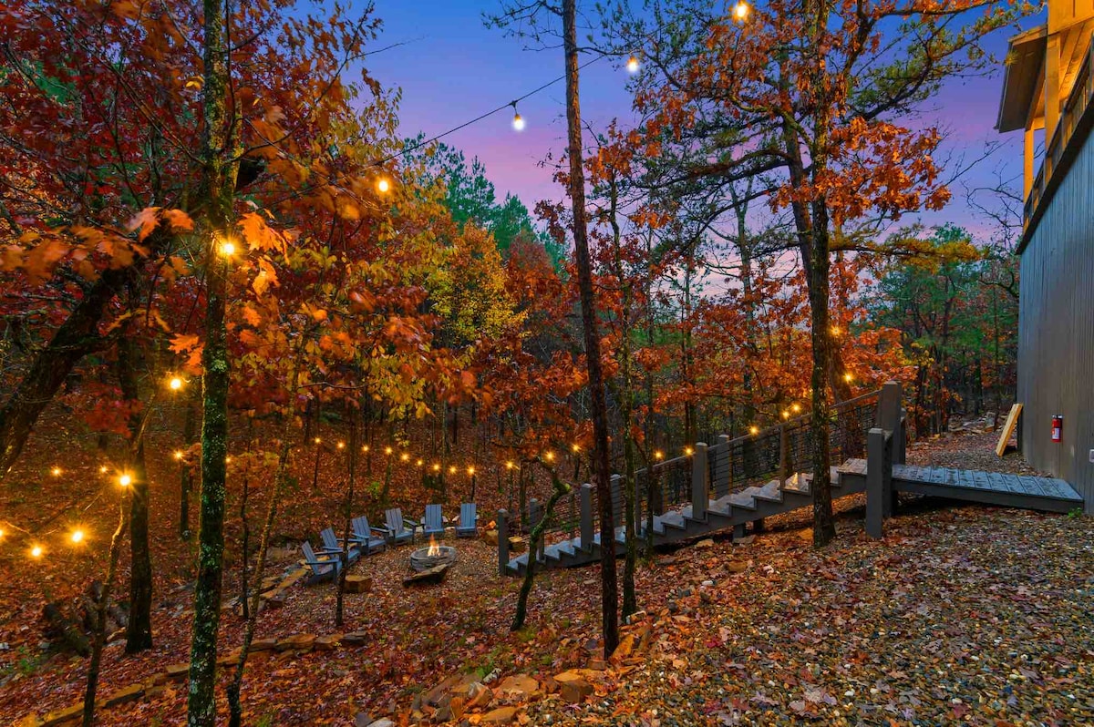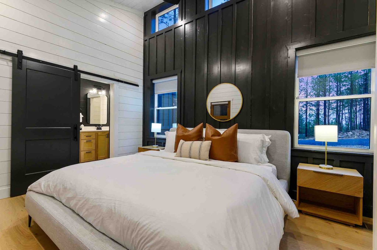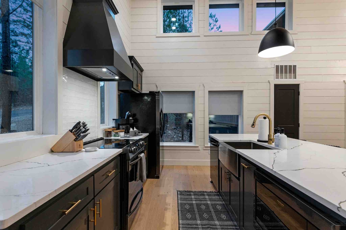 The spaceUpon entering this NEW, modern, and high-end furnished cabin, you'll be greeted by expansive windows framing breathtaking views. Step onto one of two decks to savor the scenery. Gather around the exquisite live-edge acacia wood dining table, perfect for creating unforgettable memories with seating for up to 10. Venture down to the fire pit for s'mores and creek-side fun