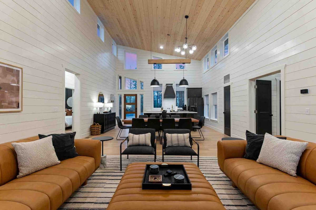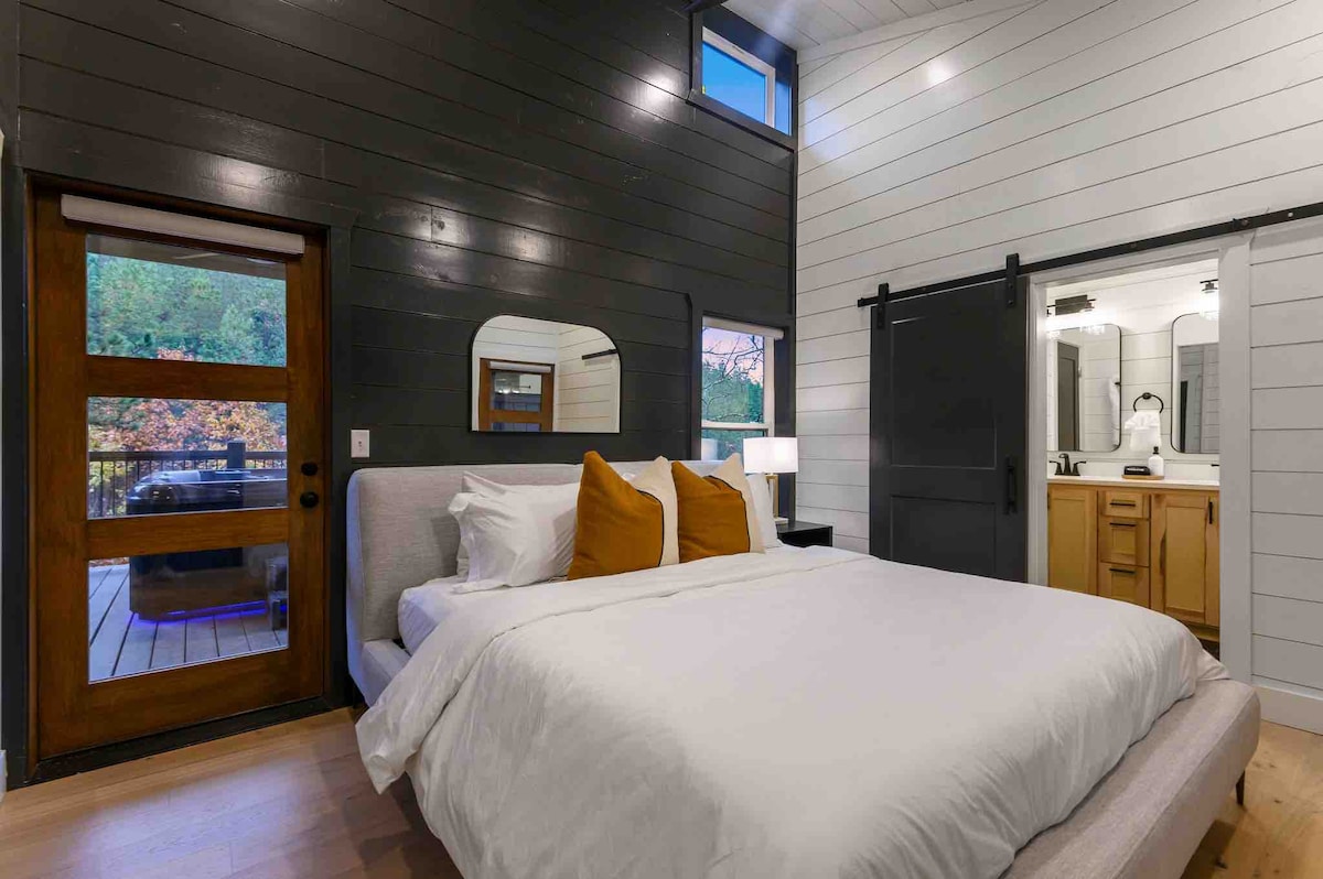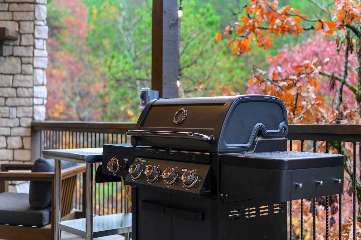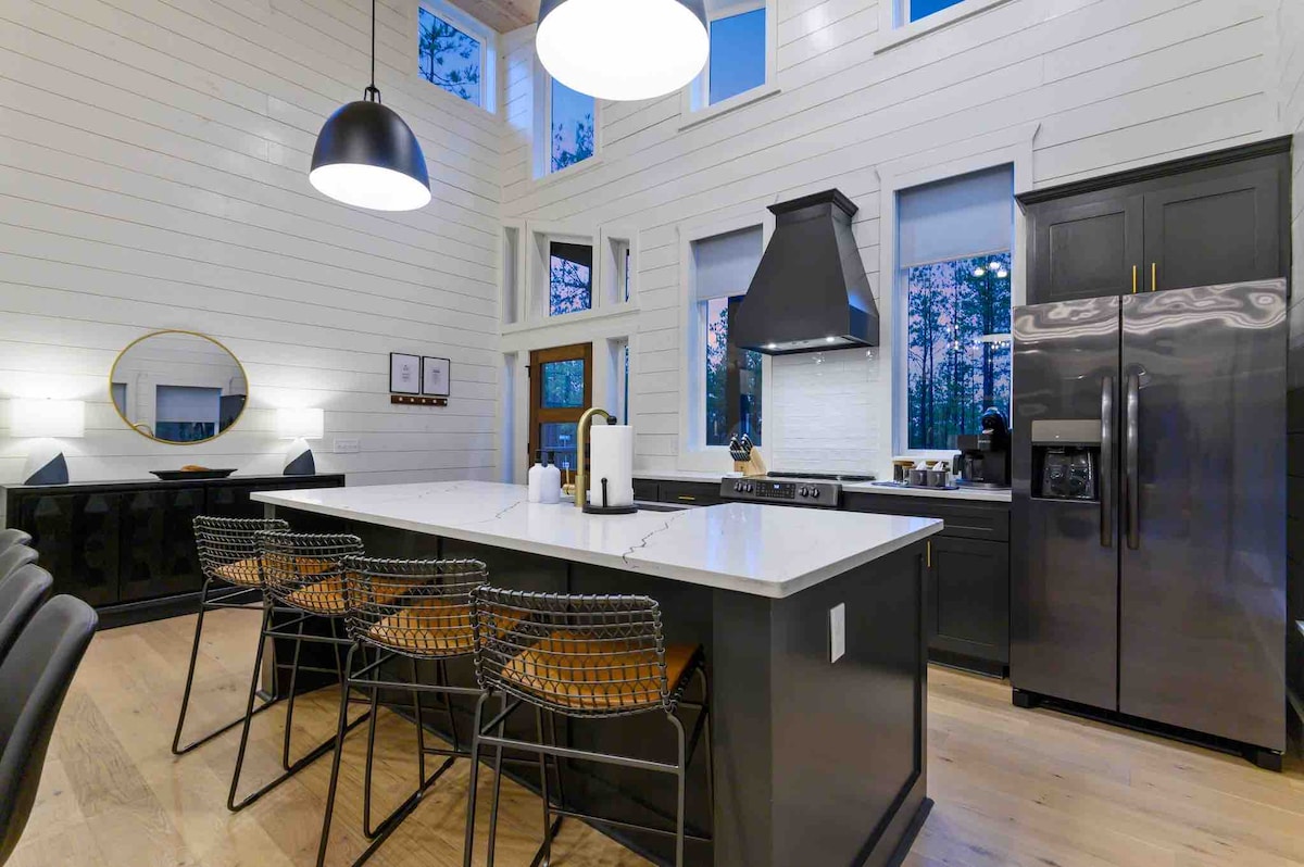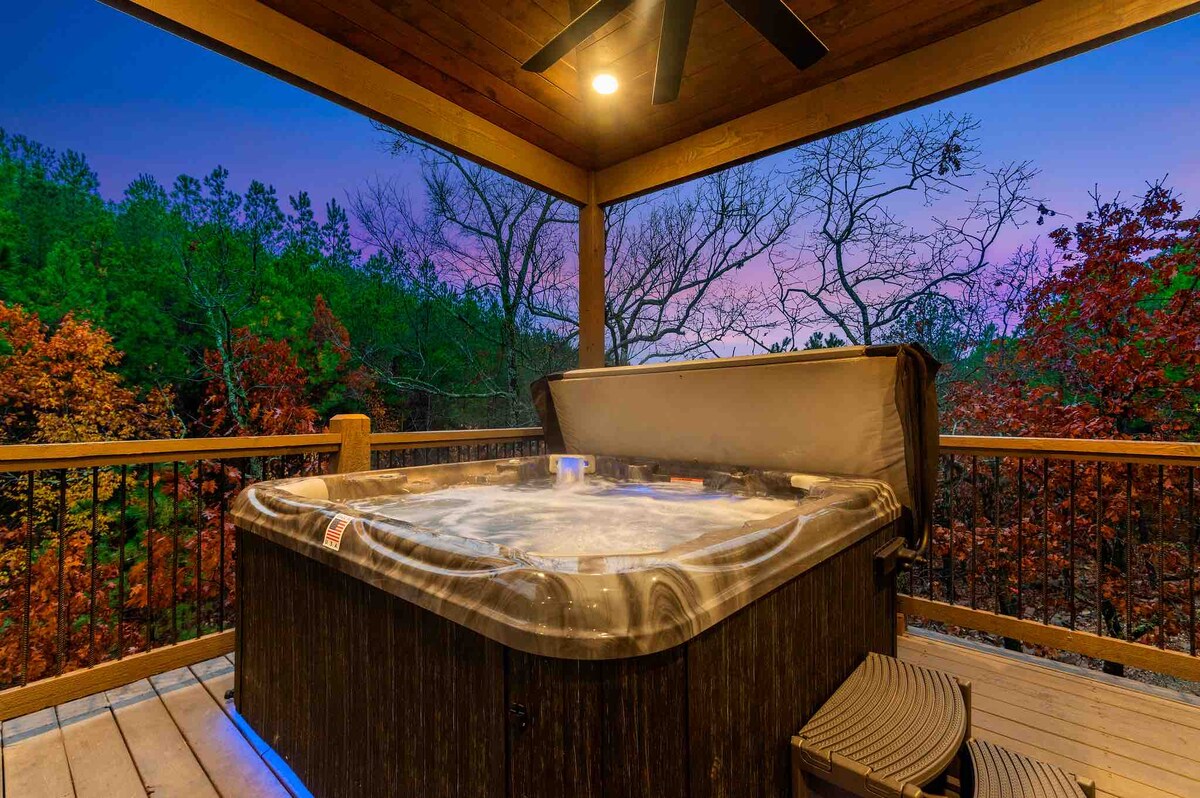 The spaceUpon entering this NEW, modern, and high-end furnished cabin, you'll be greeted by expansive windows framing breathtaking views. Step onto one of two decks to savor the scenery. Gather around the exquisite live-edge acacia wood dining table, perfect for creating unforgettable memories with seating for up to 10. Venture down to the fire pit for s'mores and creek-side fun